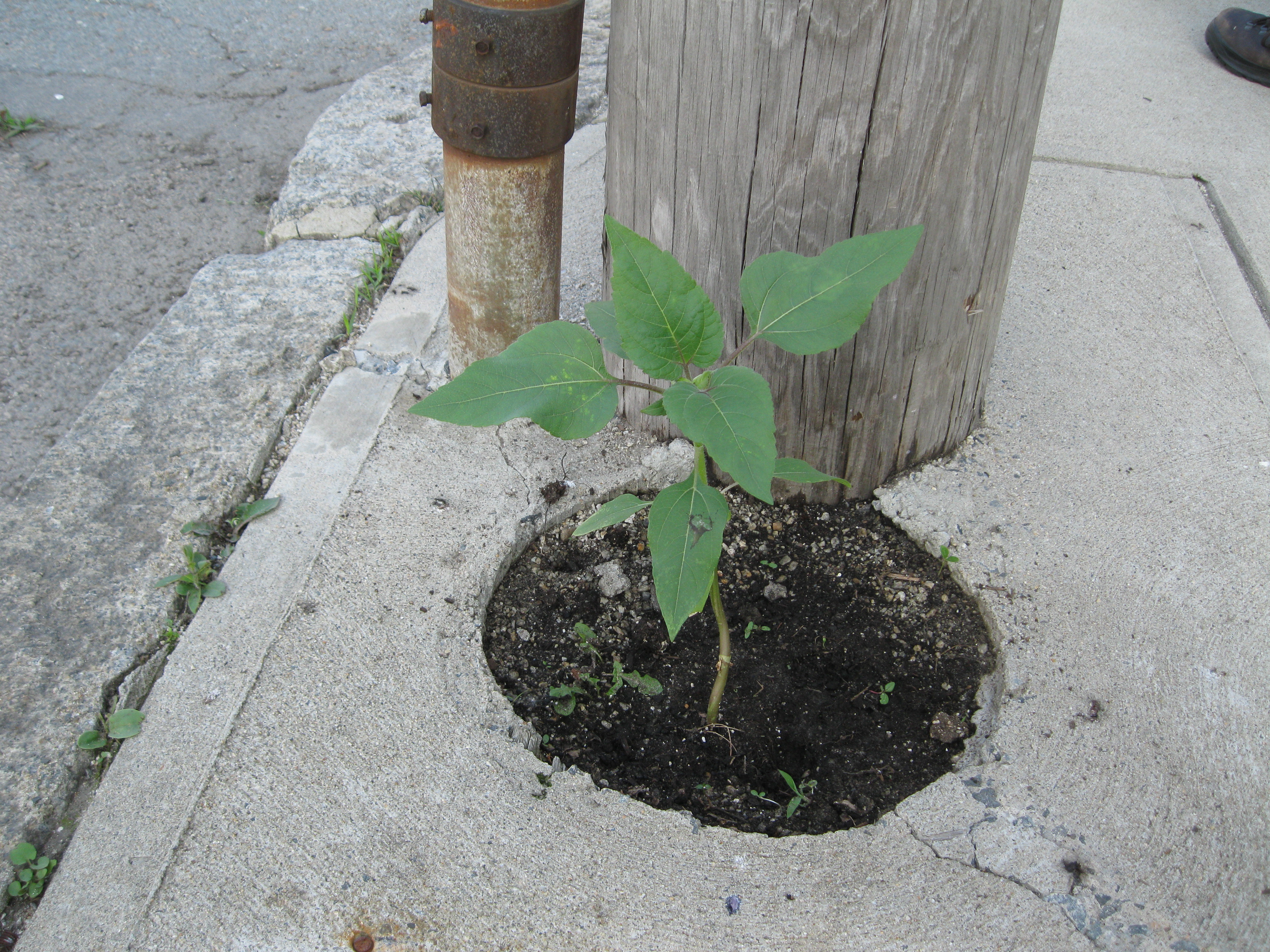 and YAY for the brave little plant growing up through the concrete! do you have any idea if the space around it was pre-existent, or it just started growing on its own and someone cleared the circle of concrete around it to give it room to grow?
