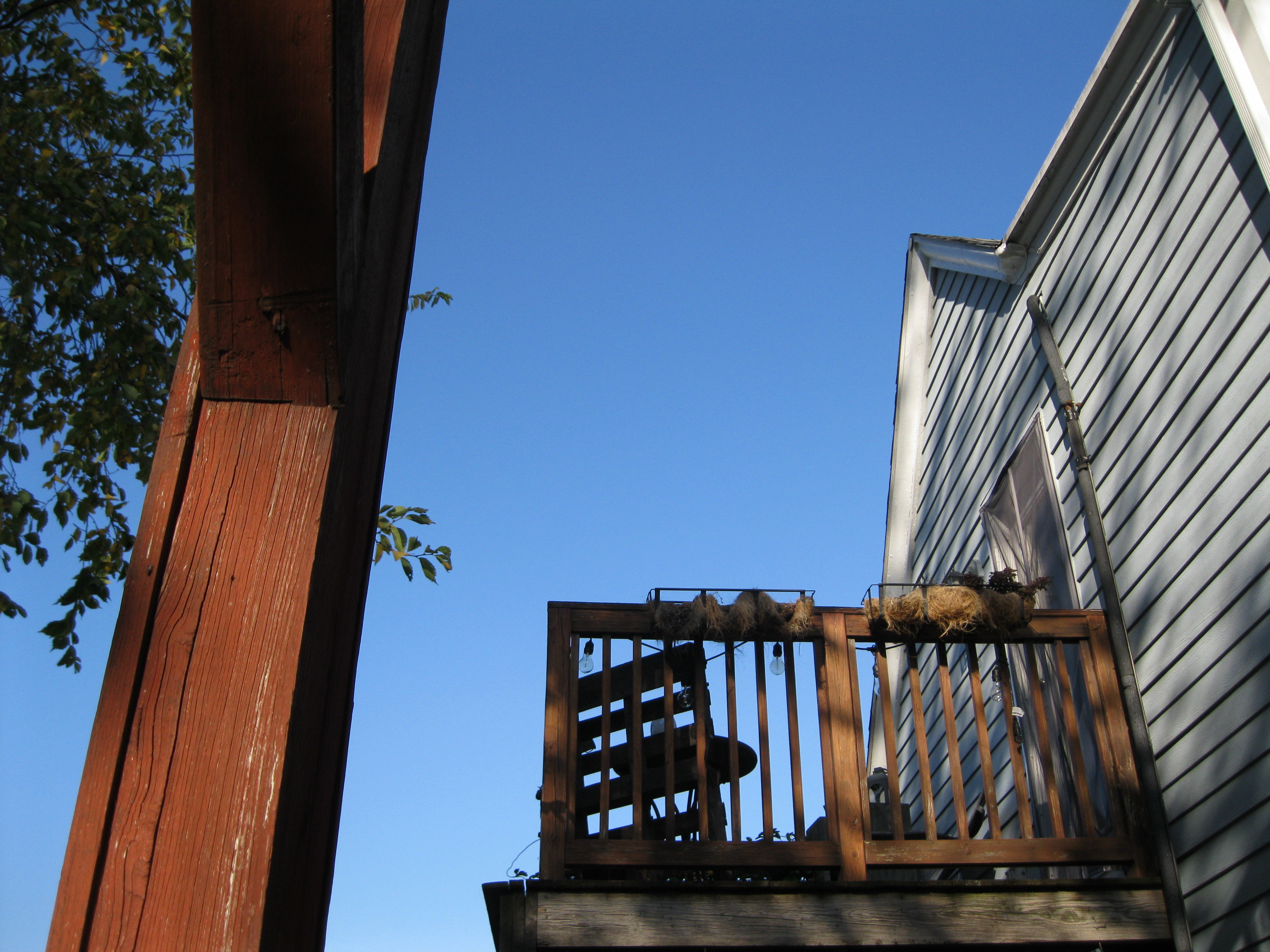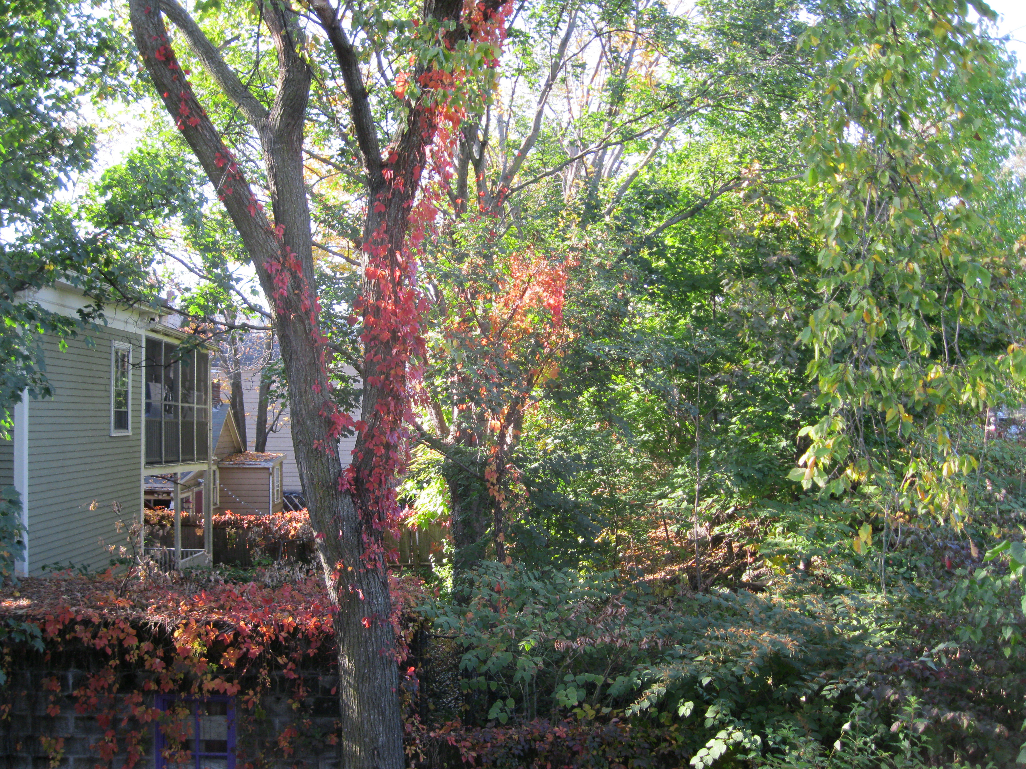 Today was mostly, unfortunately, awful, but I spent some of the early afternoon on the back deck and enjoyed the turning leaves of the ivy in the yard and the fences beyond our treeline, plus the cross-hatched angles of a neighbor's third-floor deck against the dissolving blue of the autumn sky.