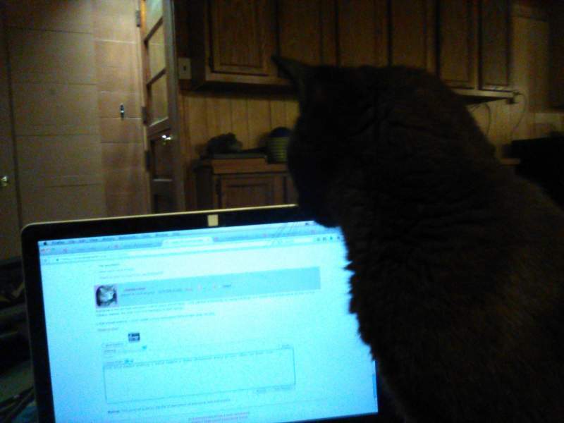 I got a very bad picture of the little astronaut who trotted audaciously up the stairs to the sun porch once his sister had jimmied the closed but signally not locked door because I was engaged primarily in preventing him from further exploration, but he can be glimpsed looking back to his handler for instructions. She made a bolt for the forbidden territory herself while I was in the process of returning him. Both cats were successfully gathered and replaced so that my mother can keep breathing in her own home. I had naturally been on the phone with
