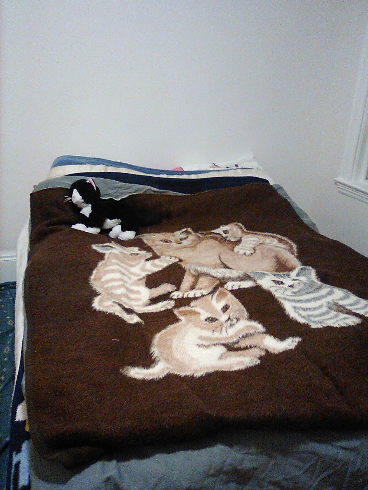 Our home is accreting slowly, less dustily so far than the disk of a galaxy. We have all of our furniture, but not yet in all the right places. We have too many boxes piled on too many boxes containing too many things we need to unpack. Almost all of the fragile things are still in storage and almost all of my clothes are still at my parents' house. We are not actually sure what happened to our quilt. All of the wall sockets in this apartment are in peculiarly inconvenient locations and we need so many more lamps than we we presently own. There is no art up on the walls. Nonetheless, this afternoon we anchored the extant bookshelves to the wall and our mattress and box spring were delivered, so that even without the frame—it's still in transit—we have been able to construct a proper bed. It is here depicted with Doppel-Abbie and its signature blanket of a mother cat with her kittens, to which our own kittens have added their embroidery over the years. We need more rugs. We will learn to live here.