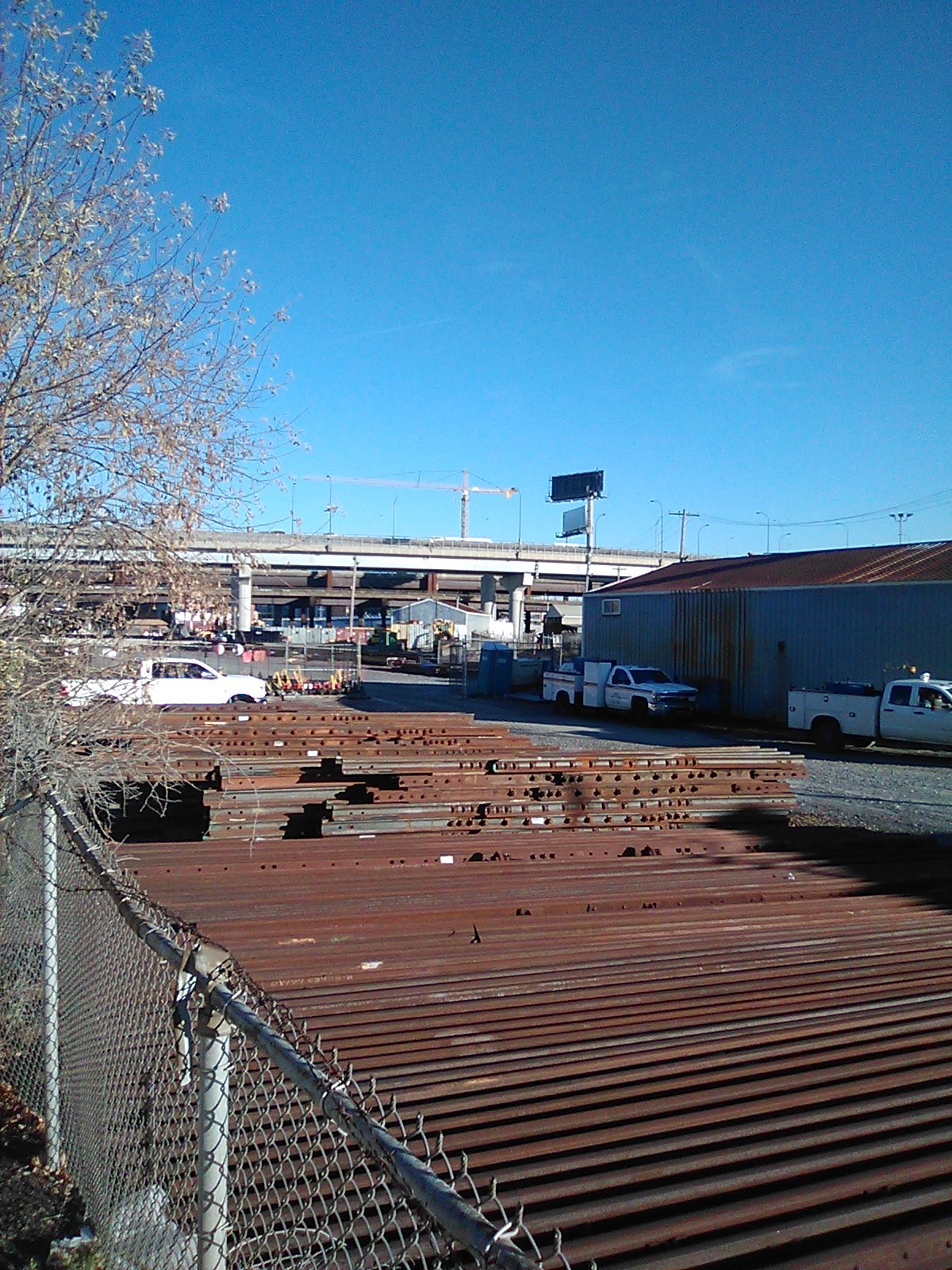 I have been trying to get an identification on this stretch of railyard since discovering it last year and I still don't know what it's called. It is clearly a staging area of some sort, since the track components stored there have changed with some regularity over the months; it partly incorporates some of the disused siding of the industries on either side, but at least one set of tracks seems to run under the concrete stalks of the Northern Expressway and on to Sullivan Station, whether they are still used for that purpose or not. There are sheds and trucks and signs from the MBTA. Several of them impress that it is a hard hat area and not to be trespassed on, which is one of the reasons I don't have as much information on the space as I would like, the other being that it's much harder to wander down to now that I live at literally the other end of the city.