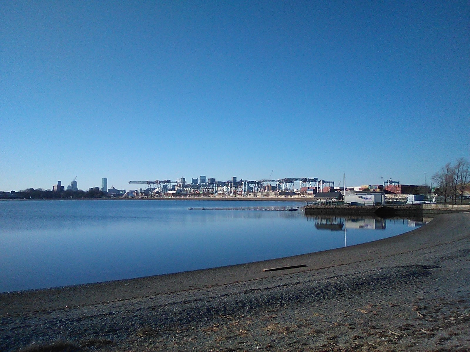 The cranes of Conley Terminal. The new ones, shipped last summer from Shanghai to service the Neo-Panamax container ships which the channels of Boston Harbor were dredged to accommodate. Close to, they were bleached almost as pale as the winter sky.