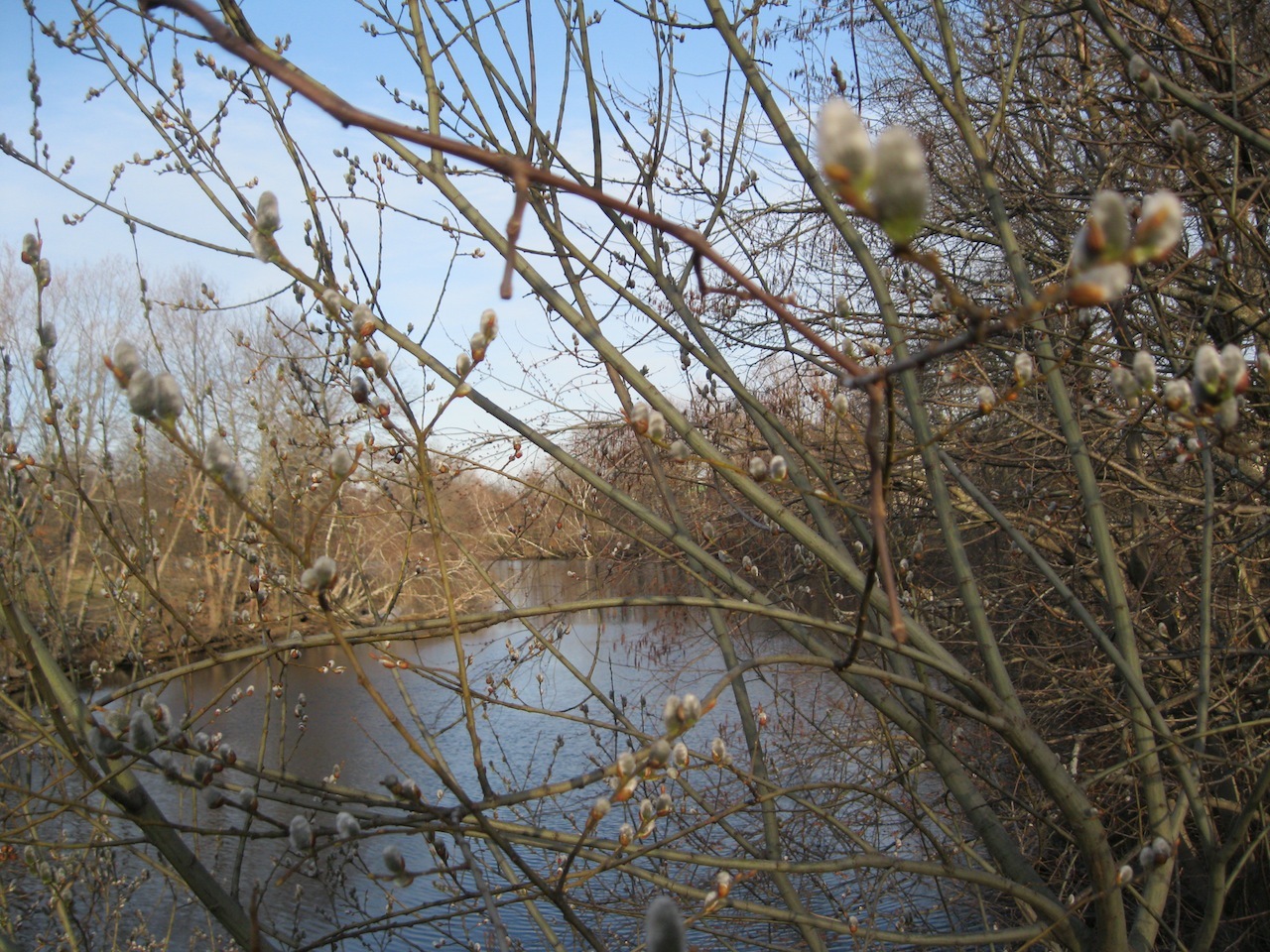 Looking through a pussy willow screen. There were two swans on the river as we crossed it, one on either bank.