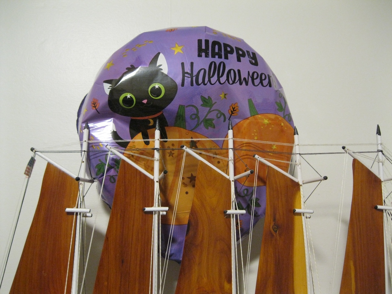The balloon which my mother bestowed as a gift on her grandkittens in mid-October has been steadily losing altitude over the last week, causing it to fetch up in strange corners of the house, such as behind the bedroom's model ship.