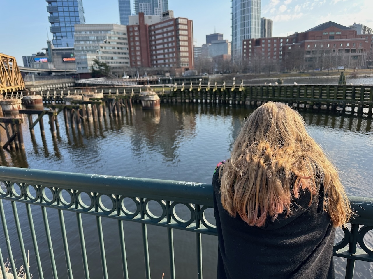 She alternated between racing ahead of me among the Canada geese and the willows and hanging on the rail to stare at the water, which I was certainly not going to discourage.