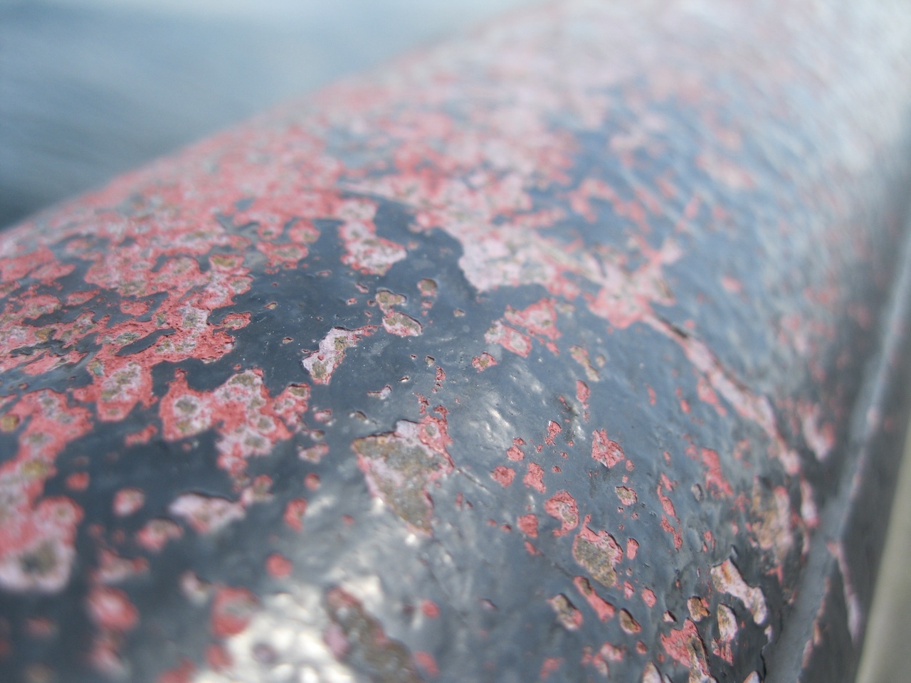 The paint of the handrail had rusted and pitted until it looked like barnacles or coral or poisonous coloration.