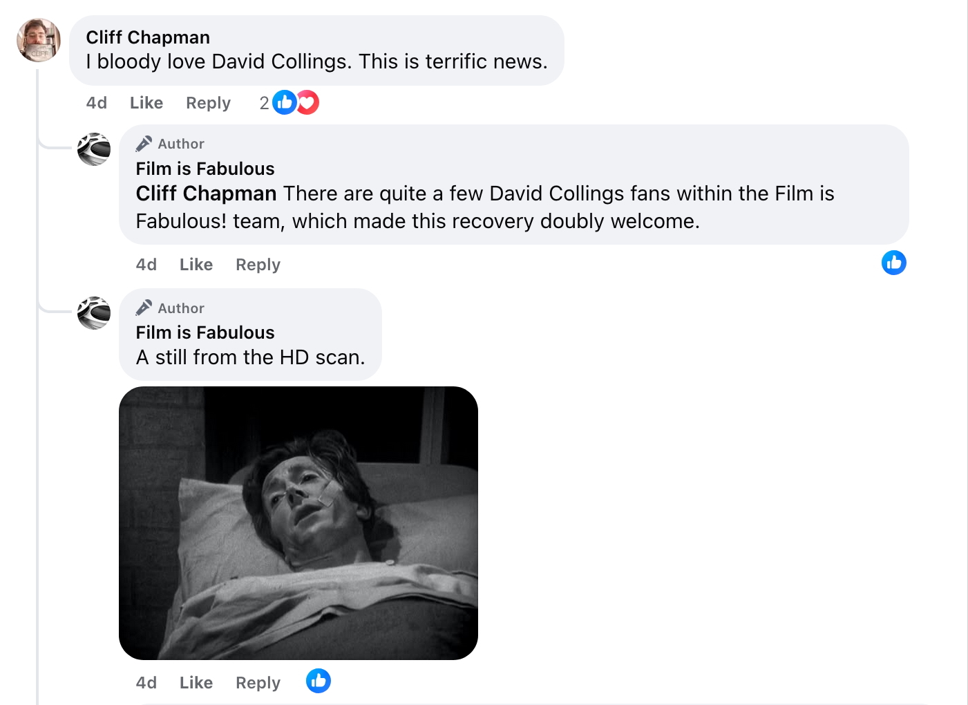 I haven't got a link for this because I was told it by Mariocki on tumblr (but they are a reliable source as they usually get these things from Kaleidoscope or the like), but someone has found a lost episode of the BBC medical soap Emergency Ward 10 from 1966, and the cast includes a guest spot from a wee David Collings. As it is a medical thing, I feel reasonably confident that he is likely to be suffering suitably, possibly even dying. Should it ever come round on TPTV or by any means I can see it, I will let you know.