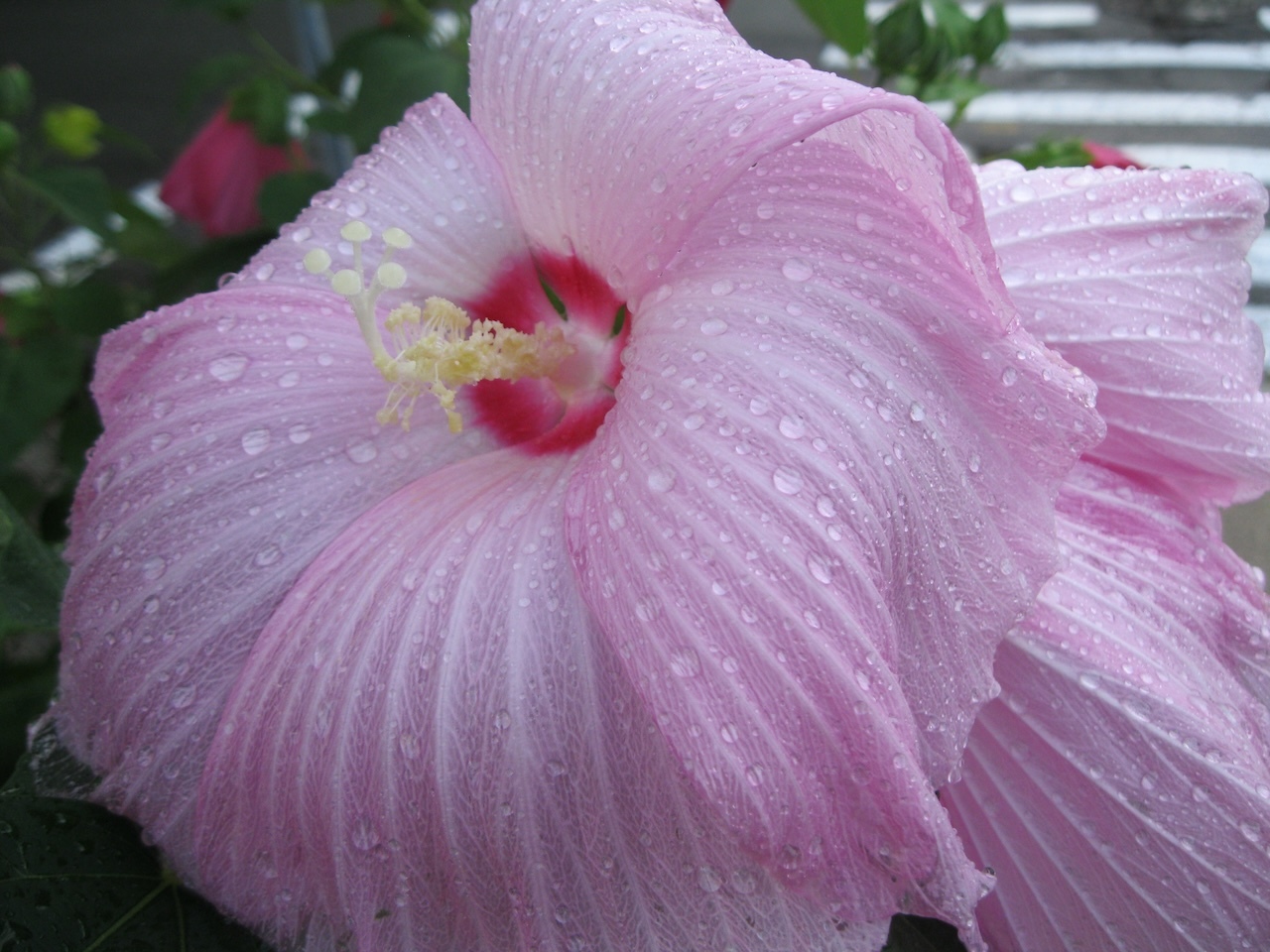 The neighborhood hibiscus are reliably beautiful in all weathers.