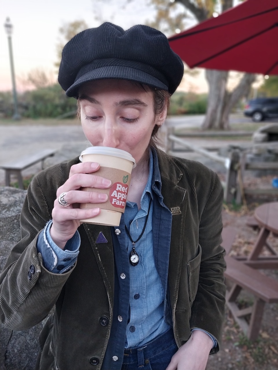 I hadn't had perry since before the onset of the pandemic. I had never had it served hot, as is autumnally usual for cider in these parts. I have no idea if it's even traditionally supposed to be, but it was astringent and gorgeous and kept my hands warm as the temperature drifted downward from the fifties Fahrenheit and I had no idea their cidery had branched into pears. We had a half-dozen cider donuts fresh out of the fryer and exactly one survived to come home.