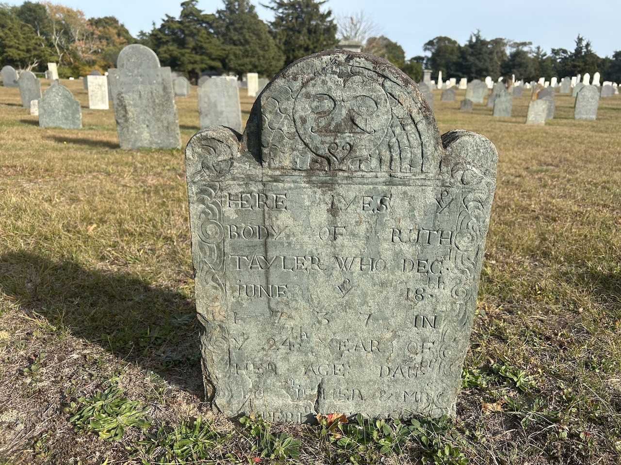 The oldest gravestone of which I got a picture looks like Ruth Tayler d. 1737. It is not visible over her shoulder in particular, but it was extraordinarily strange to me that someone had gone through the cemetery and put modern American flags on the graves of veterans of the American Revolutionary War.