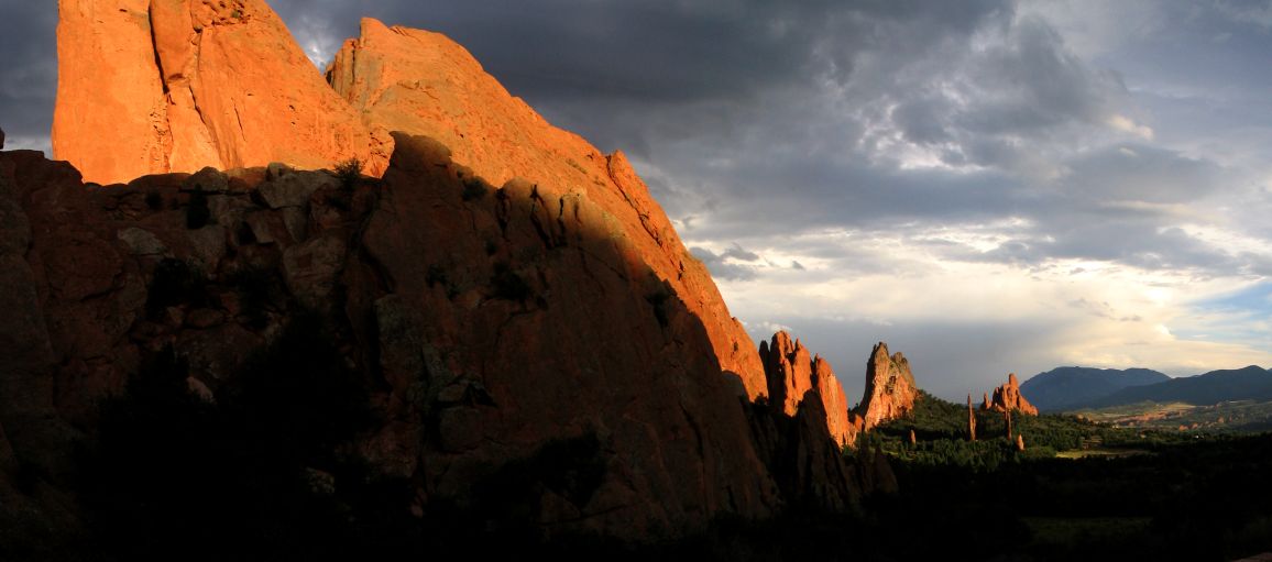 When it is overcast overhead, but clear to the west, so the sun lights up the orange-red rocks against the complementary blue-gray sky, like this